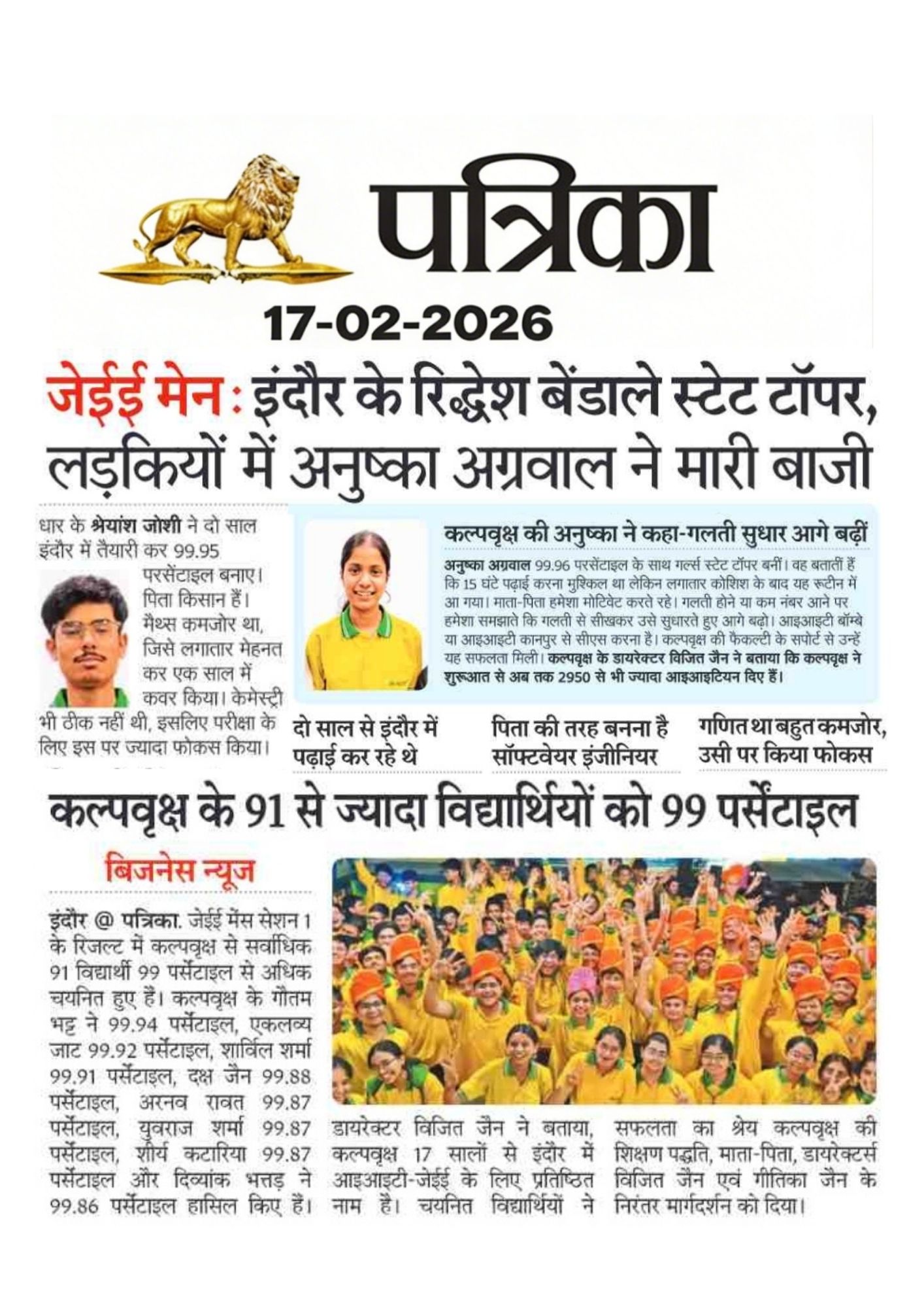 FOR OVER A DECADE AND A HALF, KALPAVRIKSHA INSTITUTE HAS BEEN AT THE FOREFRONT OF IIT-JEE PREPARATION IN INDORE. OUR REMARKABLE JOURNEY HAS BEEN DEFINED BY ONE CONSISTENT THEME: SUCCESS. WE'VE CONSISTENTLY PRODUCED TOP-NOTCH RESULTS AND ACHIEVED THE BEST SELECTION RATIO IN MADHYA PRADESH.